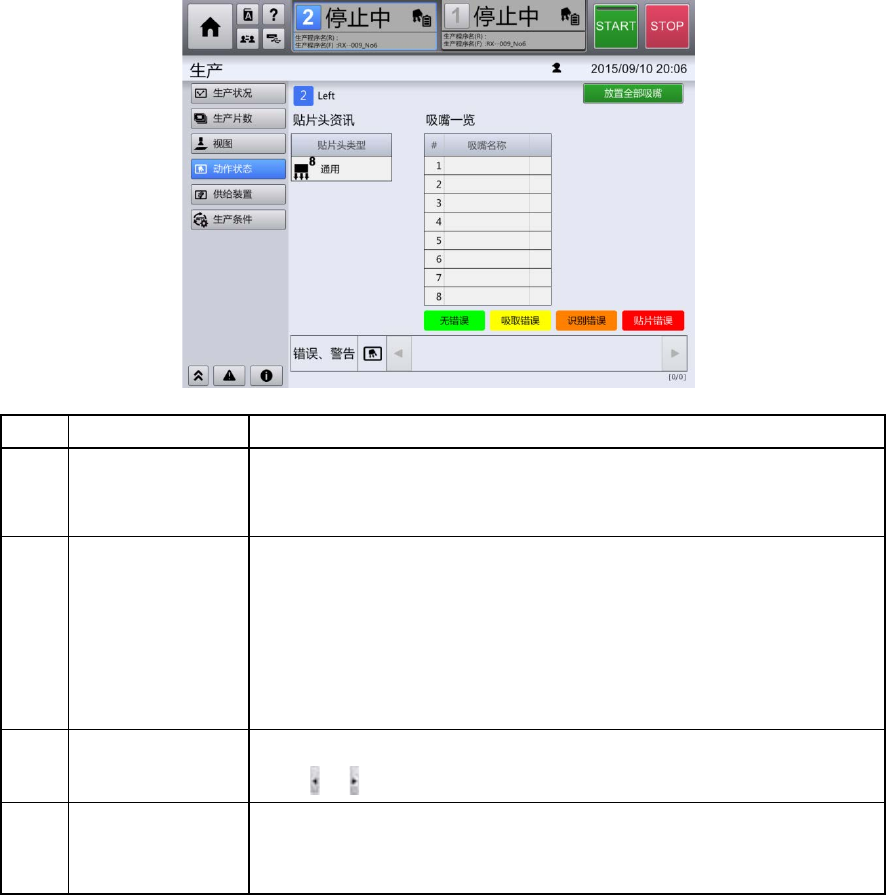 在[动作状态]画面中,可确认共通面板中选择的,生产中单元内的贴片头运行状况,错误状况,警告状况。