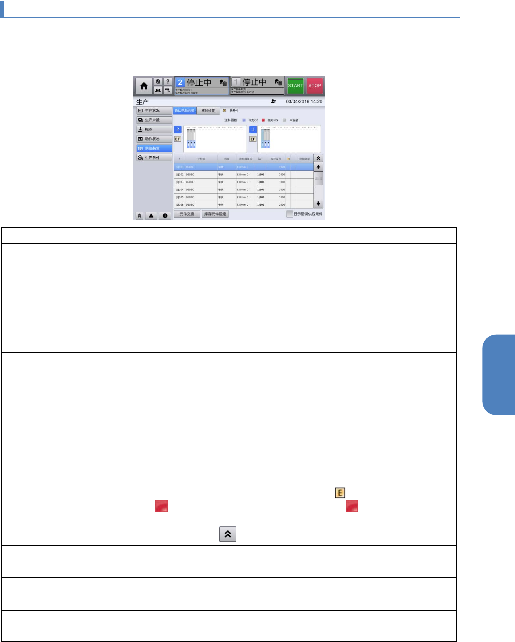 在[供给装置]画面中,可确认供给部元件的配置状况,以及错误,警告状况。此外,还可在此画面上进行