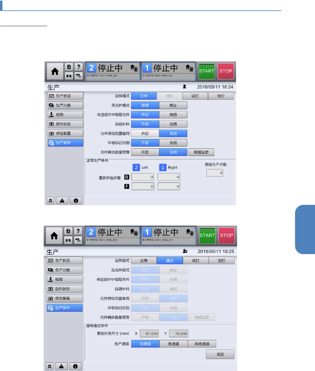 即开始指定的基板外形尺寸、生产通道的通过模式运转。