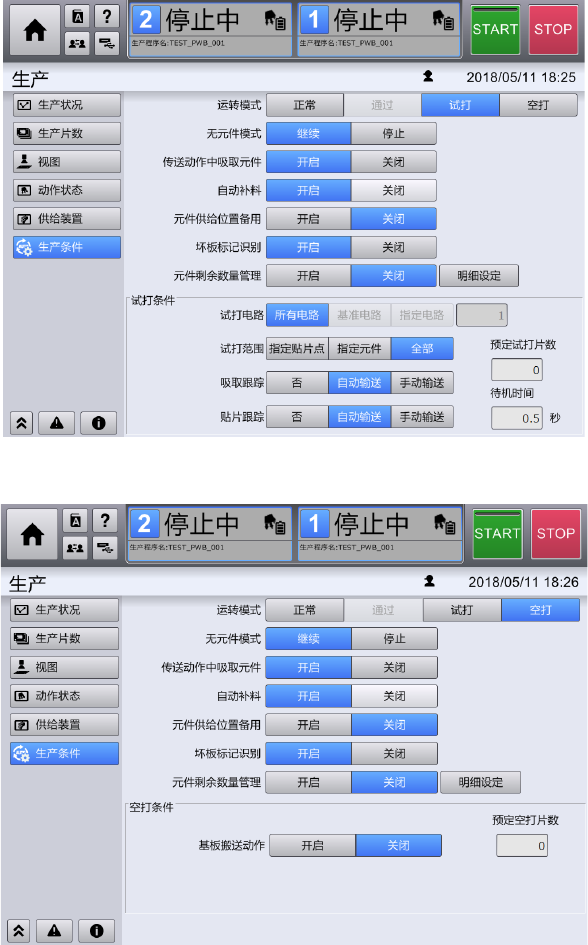 按钮后,基板外形尺寸、生产通道即被设置。然后,触摸[START]按钮,
