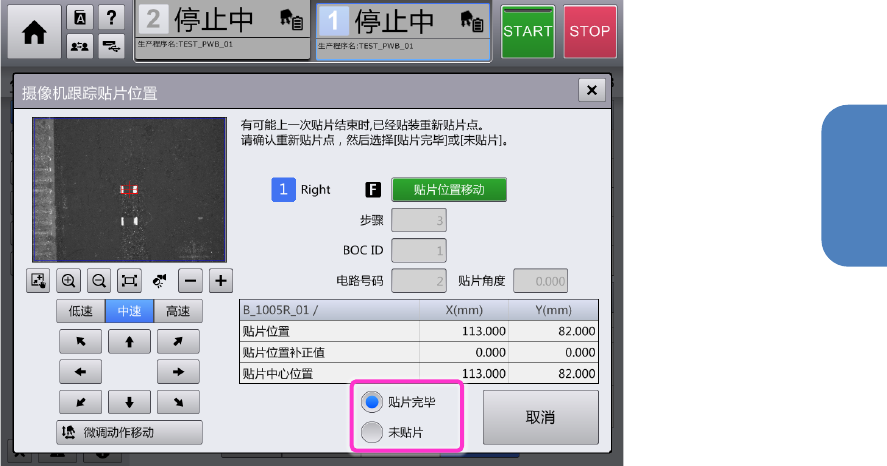 片完毕]。如果是贴片失敗,由于元件尚未贴装,因此如选择[未贴片]后用[START]按钮重新开始生