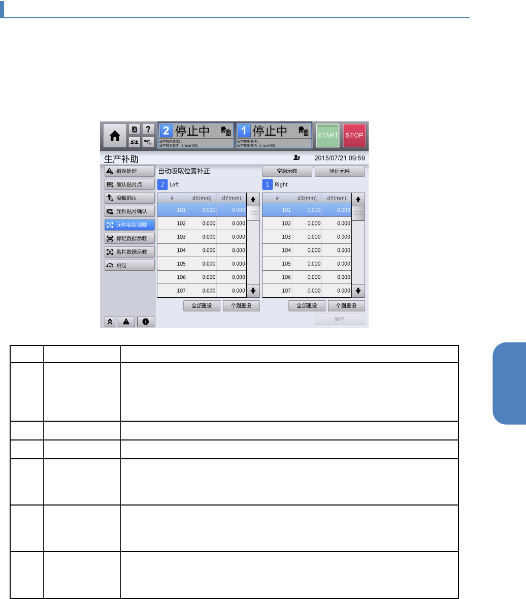 第 4 章 操作篇 4- 6. 生产补助 117 4 4-6- 5 . 元件吸取调整 触摸 [ 生产补助 ] 菜单中的 [ 元 件吸取调整 ] ,显示 [ 元件吸取调整 ] 画面。 在 [ 元件吸取 调整 ] 画面中,可 根据 生产 中吸取元件的确 认结果,确认自 动吸取位置补 正的补正值, 该补正 值可自动补正 元件 的 吸取 中心位置。 此外,根据生产 程序切换等需 要,可以 供给部 为单位重置自动 吸取 位置补正的 补正值,或打 …