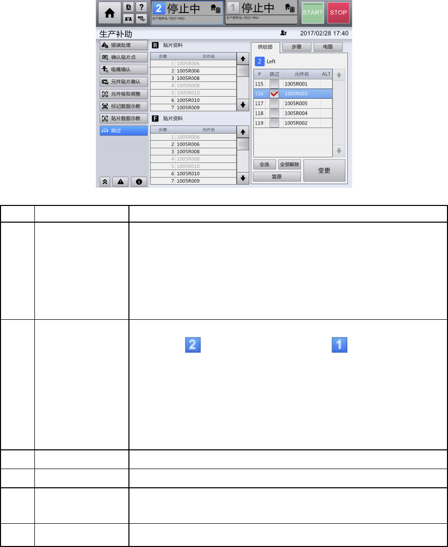跳过:显示使用对象供给位置编号的贴片步骤的跳过状态。选中