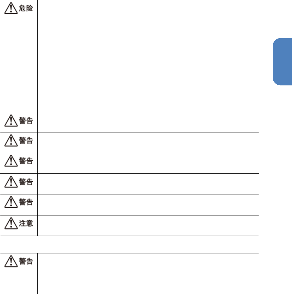 第 1 章 安全注 意事项 1- 2. 免责声明 6 1- 2. 免责声明 以下情况发生的 故障不在保证 范围之内: • 使用中发生天灾 引起的事故 • 未经允许的本机 改造 • 使用本公司指定 以外的零件保 养 • 使用的 不是从 本公司 获得的零 件保养 • 即使使用了 本公司 指定的零件进行了 保养 ,如若 起因于所 更换的零件 的缺陷所致 • 未遵循操作说明 书记载的内容 操作及使用 • 按照擅自修改的 操作说明书或 变更过的内…