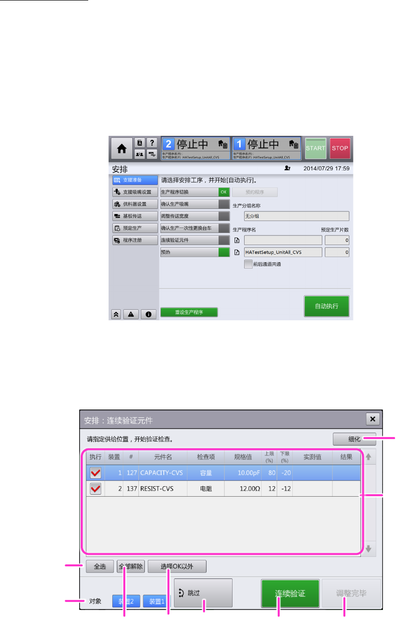 如果背景色为灰色,要触摸连续验证检查按钮使安排工序有效。(如果是在机器设置中,未将元件