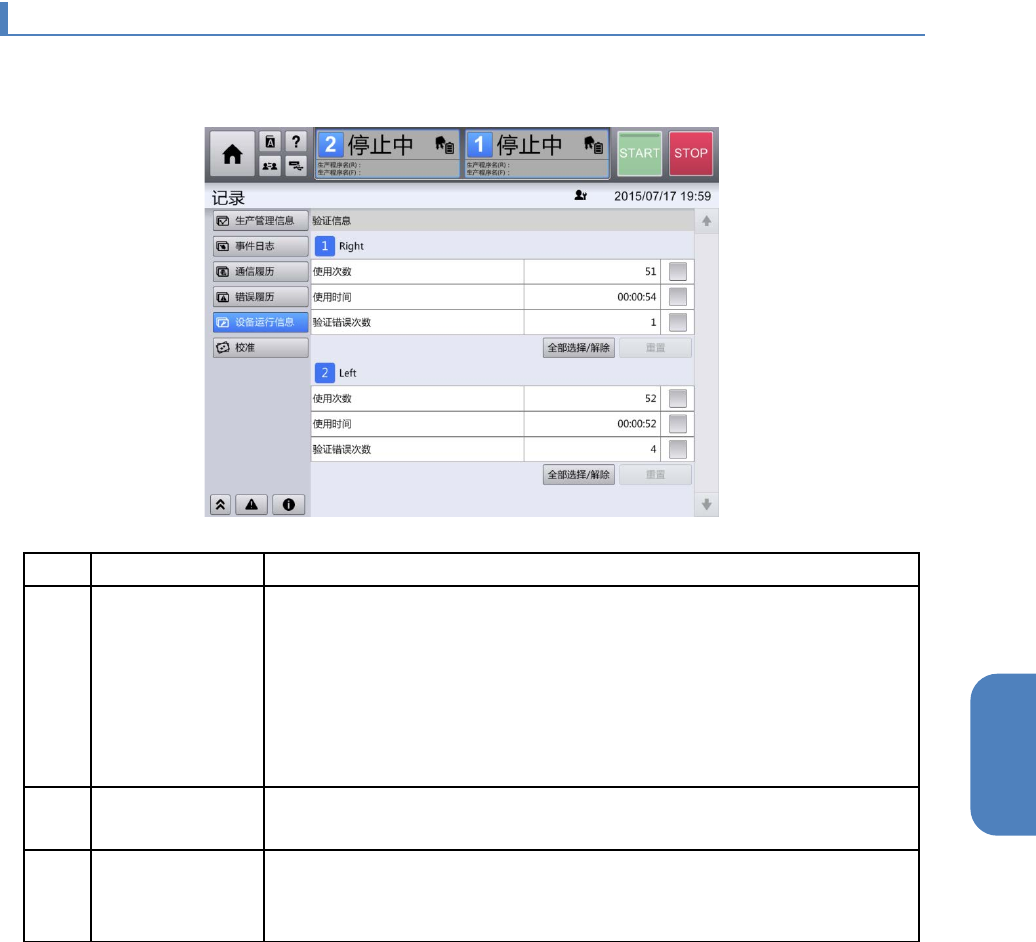 第 4 章 操作篇 4- 8. 记录 161 4 4-8- 6 . 设备运行信息 触摸 [ 记录 ] 菜单的 [ 设备运行 信息 ] ,即显示 [ 设备运行信 息 ] 画面。 [ 设备运行信息 ] 画面 ,仅当 用户级别 为 [SUPERVISO R] 或 [MAINTENA NCE] 时,才会 显示。 记号 名称 说明 (a) 验证信息 显示单元 1 及单元 2 相关 CVS 单元 使用 状况的 • 使用次数 • 使用时间 • 验证错…