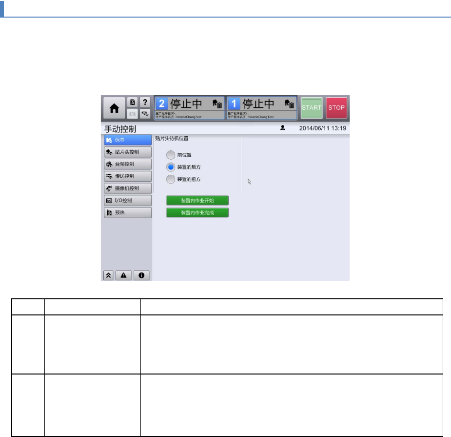 第 4 章 操作篇 4- 9. 手动控制 163 4 4- 9. 手动控制 本机停止时,如 果从顶部菜单 中选择 [ 手动 控制 ] ,将打开 [ 手动控制 ] 菜 单,可分别对 本机的各种驱 动部分 进行手动操作。 在 [ 手动控制 ] 菜单 中,可操作 如下项目。有 关各项操作 的详情,请参阅 各项目的说明 页面。 • 保养 (4-9-1.) • 贴片头 控制 (4-9-2.) • 台架控制 (4-9-3 .) • 传送控制 (4-…