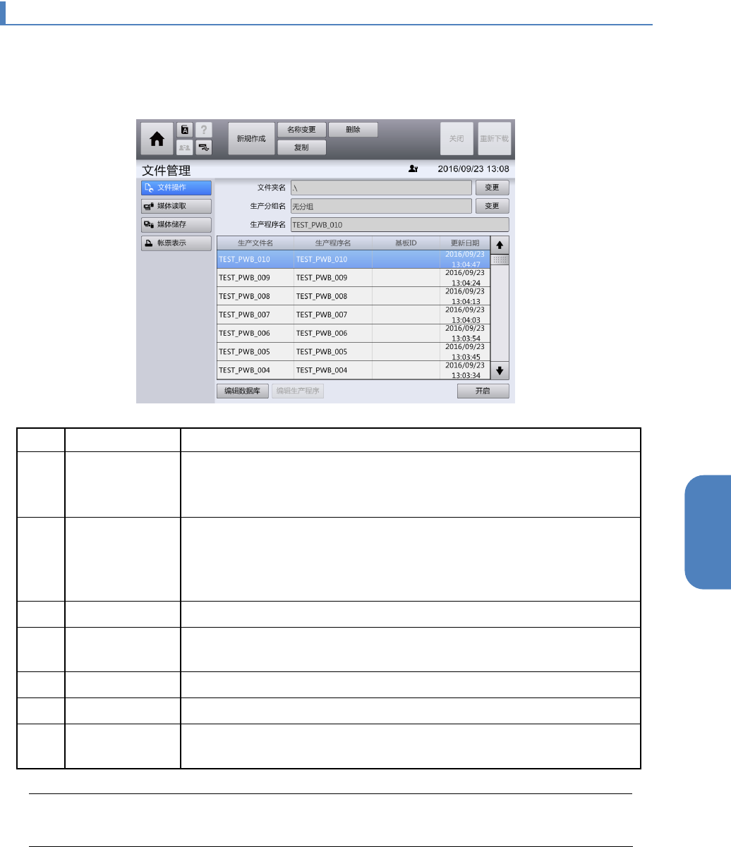 在[文件操作]画面中,对[编辑生产程序]菜单中处理的文件输入进行管理。可选择对象数据后编辑。