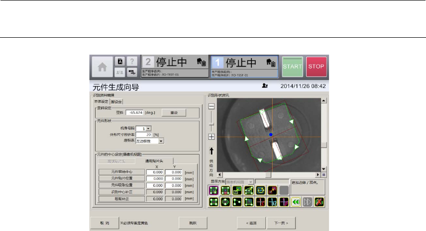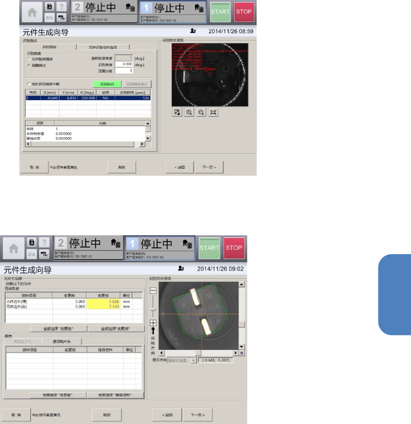 第 4 章 操作篇 4- 14. 数据制作步 骤 325 4 12 触摸 [ 下一页 ] 。 显示 [ 识别 测试 ] 画面。 [ 识别测试 ] 选项 卡,可在 [ 吸取、废弃 ] 画面中吸取 元件时,使用 [ 识别资料编 辑 ] 画面中制作 的元件 识别数据,对元 件进行识别测 试。 [ 元件识别动作 选项 ] 选项卡, 可对元件识别 功能或背面 贴片检测功能的 详细参数进行 设定。 13 触摸 [ 下一页 ] 。 在 [ 基本信息 …