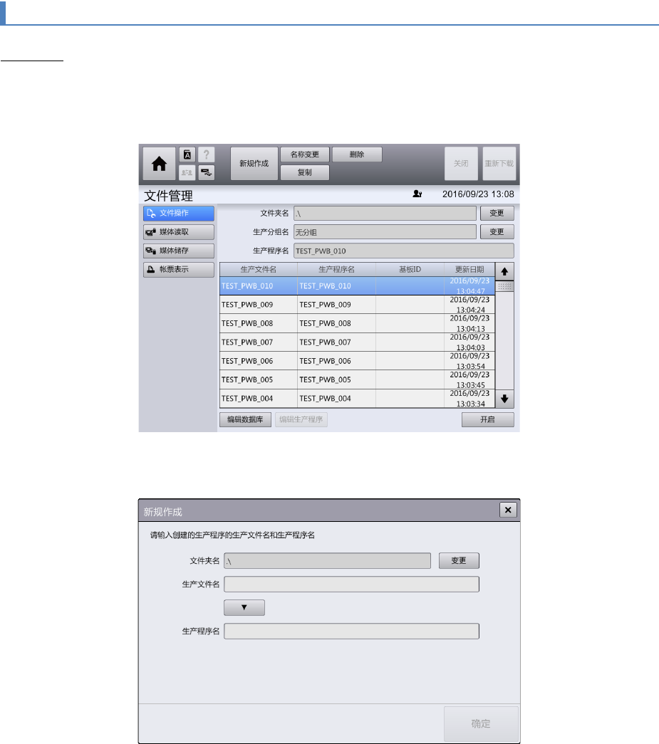 第 4 章 操作篇 4- 14. 数据制作步 骤 332 4- 14 - 9. 制作生产程序 新建数据 在顶部菜单中按 [ 文件管理 ] - [ 文件操作 ] 的顺序 触摸后,将显示 [ 文件 操作 ] 画面。 在 [ 安排 ] – [ 支援准 备 ] 画面 中 生产 程序已被载 入时,[文件 操作 ]画面 不能使 用。 如果要 新建, 请从 生产程序的重设开 始进行操作。 1 触摸共 通 面板的 [ 新规作成 ] 。 显示 [ 新规作…