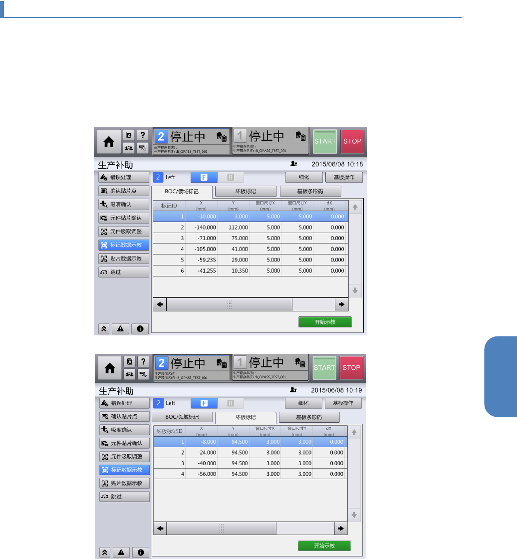 第 4 章 操作篇 4- 15. 示教 351 4 4- 15 - 3. 标记数据示教 测量生产程序的 贴片 资料 中设定的 BOC/ 领域 标记 、 坏板标记 、以 及基板条形码 在基板上的位 置,在作为 OCC 目标位置 进行修正的示 教作业中, 可确认并细化 显示测量对 象标记数据, 设置测量用的 基板。 触摸 [ 生产补助 ] 菜单中的 [ 标记 数据示教 ] ,显示 [ 标记 数据 示教 ] 画面。 [ 标记 数据 示教 ] …