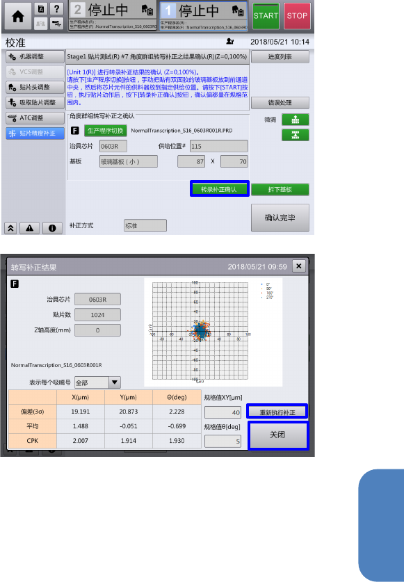第 4 章 操作篇 4- 16. 校准 399 4 5-5. 执行贴片精度测 量 所有元件贴片完 成,选择『转 录补正确 认』后,即会使 用装置内的摄 像机,自动 测量贴片后的元 件位置。 5-6. 贴片精度测定结 果 的显示 自动测量完成后 ,即显示结果 。 测量结果良好的 情况,选择『 关闭』请关 闭画面。 测量结果没成为 必要精度的情 况,选择 『重新执行补正 』,从现状的 测量结果用 自动算出补正价 值,请进行重 新补正。 要重…