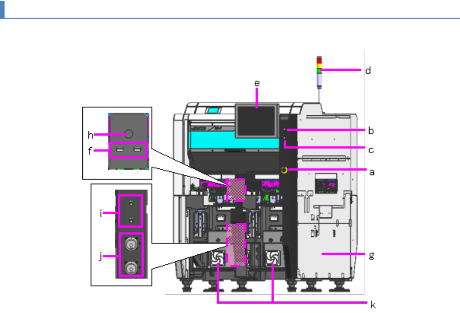 第 2 章 系统概要 2- 4. 机器的构成 RX-7 后部 (a) 主断路器 (b) Hour Met er (c) JOIN T IN (d) JOIN T OUT (e) LAN 端口 (f ) St art Int er Lock 13 2