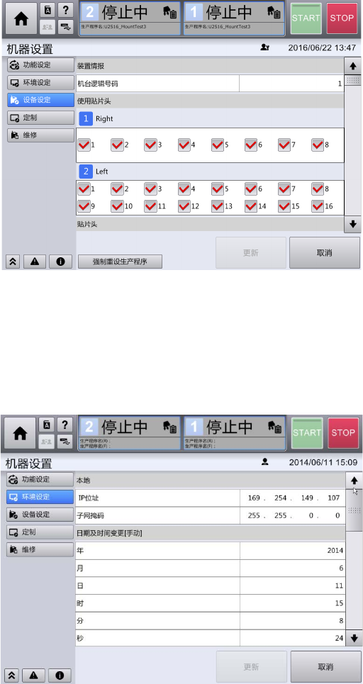 第 4 章 操作篇 4- 17. 机器设置 417 4 装置设定 在 [ 机器设置 ] 画 面中,可对装 置及动作相关 的机器参数 (动作等)进行 调整。 触摸 [ 机器设置 ] 画面左侧的子 菜单面板中的 [ 装置设定 ] ,即显示此画面 。 要更新装置设定 时,如果生产 程序已安装, 必须对生产 程序进行重设。 假如生产还未 完成,请通过 [ 支援 准备 ] 画面重设 生产程序。如 生产已完成, 可以触摸画面 左下方的 [ 強制 重…