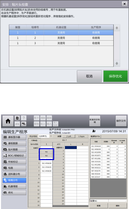 触摸[保存优化] ,则解除使用贴片头中被设定为 ON 的吸嘴号的配置 NG 并进行优化,继续进行安排工