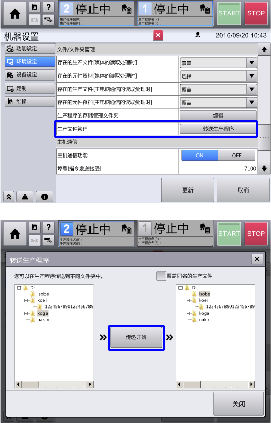 个文件夹转送到哪个文件夹,再触摸[传递开始] 按钮,于是生产程序被转送。