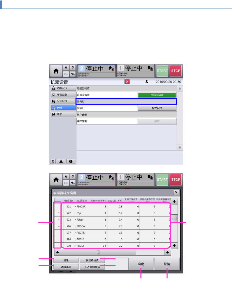 要进行吸嘴资料库的编辑时可在 [机器设置] - [定制] 画面上触摸 [资料库编辑]按钮 。出现[吸嘴资