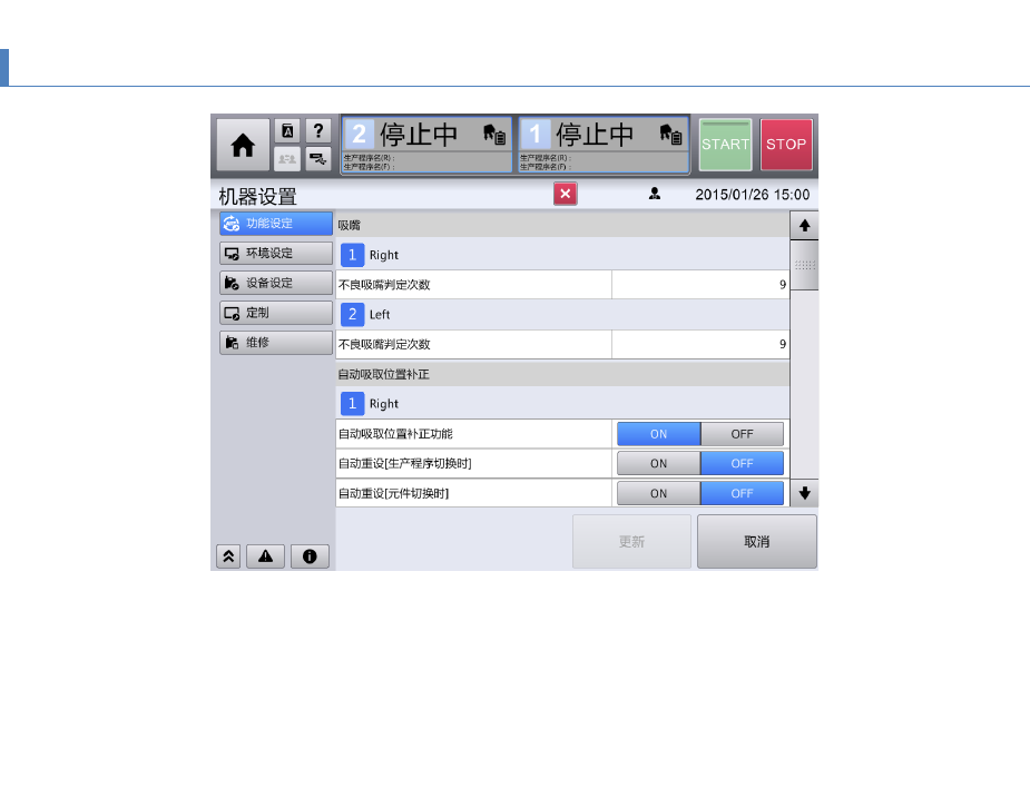 设定为 ON 时,在准备过程中,切换生产程序时,将重设各供料器的自动吸取位置补正值。(初始