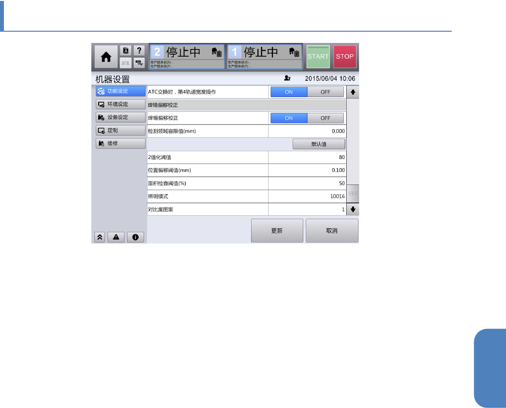 第 4 章 操作篇 4- 17. 机器设置 443 4 4- 17 - 18. 焊锡偏移校正(焊 锡印刷识别贴片位置校正) (仅当选项被设定时才 会显示 [Ver1.60 以后版本 ] )(功能设定) 焊锡偏移校正(焊锡印刷识别贴 片位置校正) 设定为 ON 后,使用焊 锡印刷识别贴 片位置校正功 能。 ( 初始值 : OFF) 。 检测领域容限值 (mm) 作 焊锡识别过 程中,要对根据 位置偏移检查阈值 计算出的范 围扩大检…