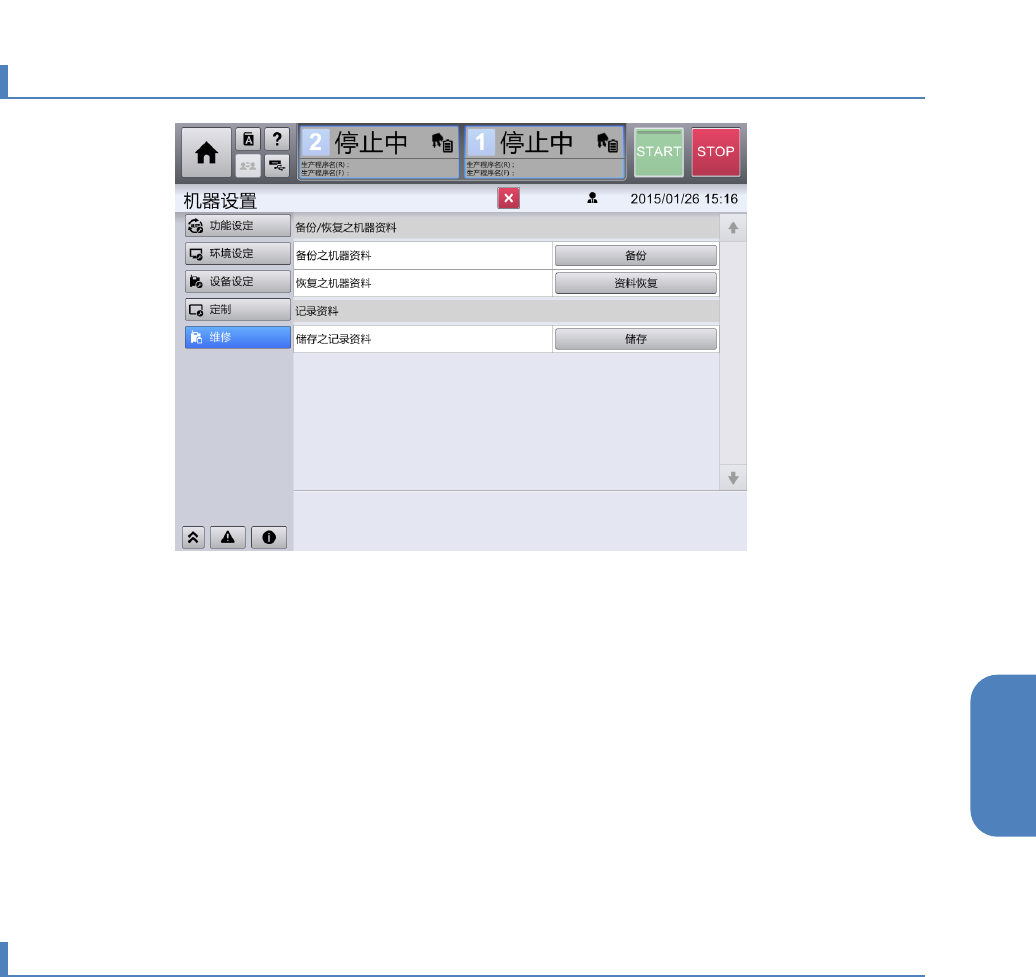 第 4 章 操作篇 4- 17. 机器设置 479 4 <维修> 4- 17 - 51. 备份 / 恢复之机器资 料(备份、恢复机器资料 ) 备份之机器资料 显示 [ 备份机器 资料 ] 对话框, 将当前机器的 机器资料备 份到 USB 存储器上。 恢复之机器资料 显示 [ 恢复机器 资料 ] 对话框, 可从 USB 存储器上读 入备份的机器 资料,对当前 装置的机器资 料中可恢 复的数据进行修 改。 校准数据也可被…