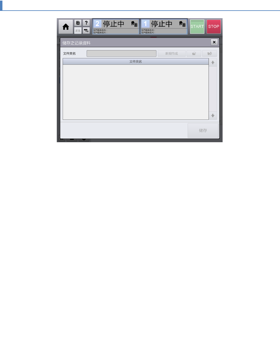 第 4 章 操作篇 4- 17. 机器设置 482 4- 17 - 55. 存储之记录资料( 保存记录资料) 文件夹名 为了保存记录资 料,需从 USB 存储器 内的文件夹名 列表中选择, 文件夹名显示 在文本区域里 。 新规作成(新建) 在 [ 文件夹名 ] 的 文本区域中编 辑新的文件夹 名,触摸 [ 新 规作成 ] 按钮后 ,即可新建该 文件夹。 打开文件夹 打开在列表中选 择的文件夹, 显示该文件夹 内的阶层。 …
