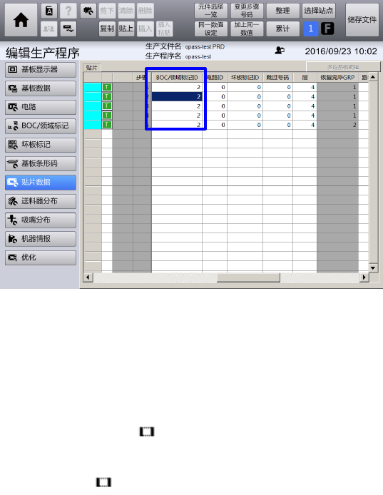 在[顶部菜单] – [编辑生产程序] – [贴片点数据] 画面中,贴片点(步骤)的 BOC/领域标记 ID,