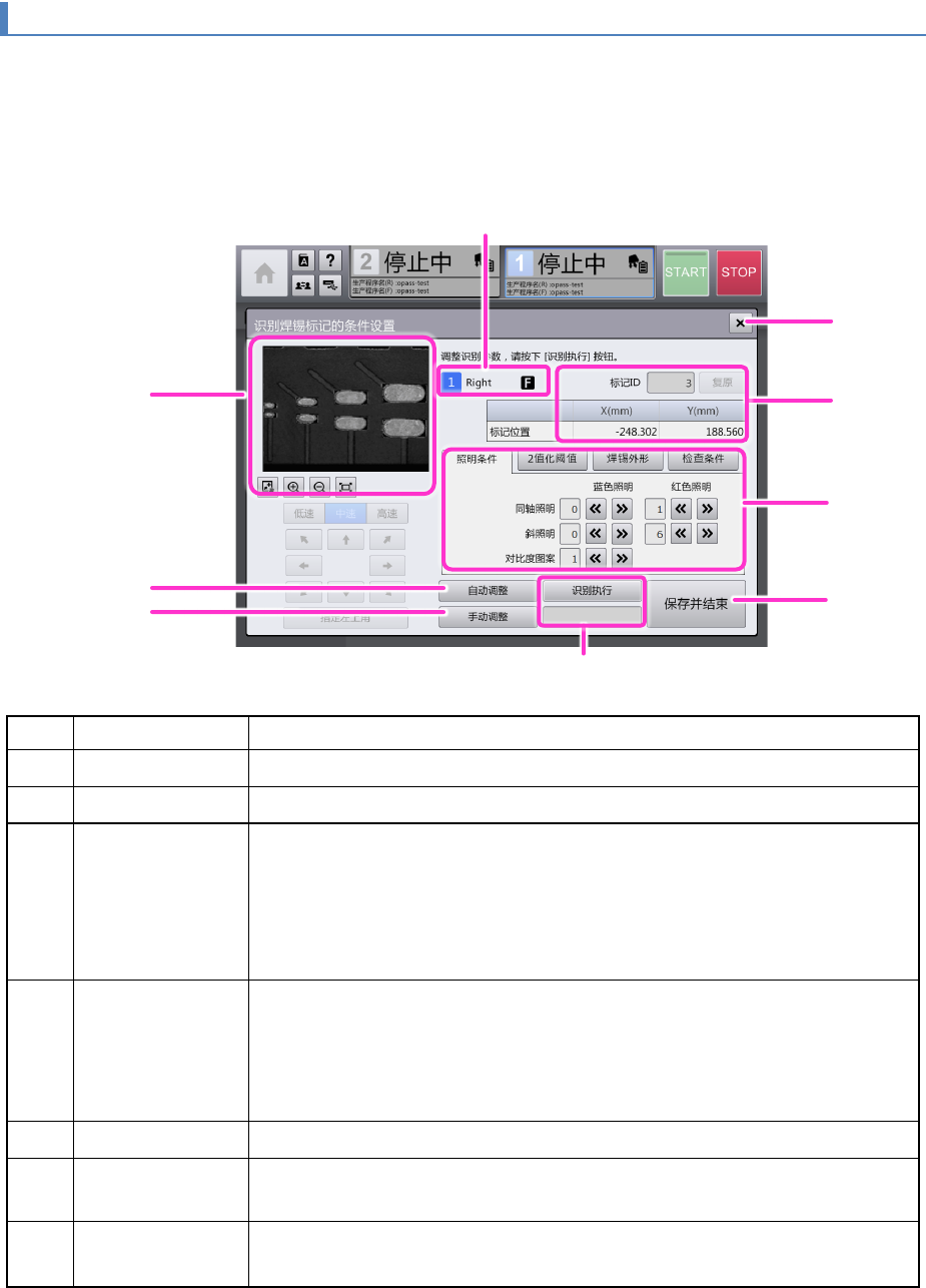 件]的各参数进行设定。可使用[自动调整] 按钮、[手动调整]按钮调出各种调整画面,以及使用[识别执