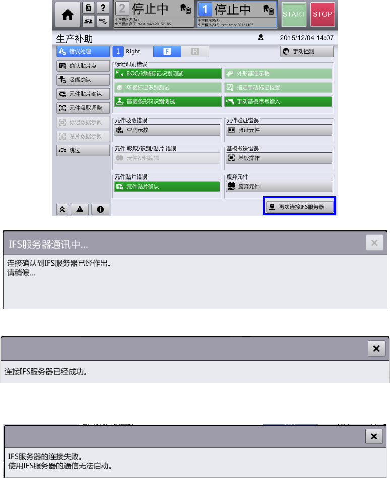 如果在生产操作中向 IFS 服务器发送信息发生了错误,机器会停止。如果未恢复通信则无法重新开始
