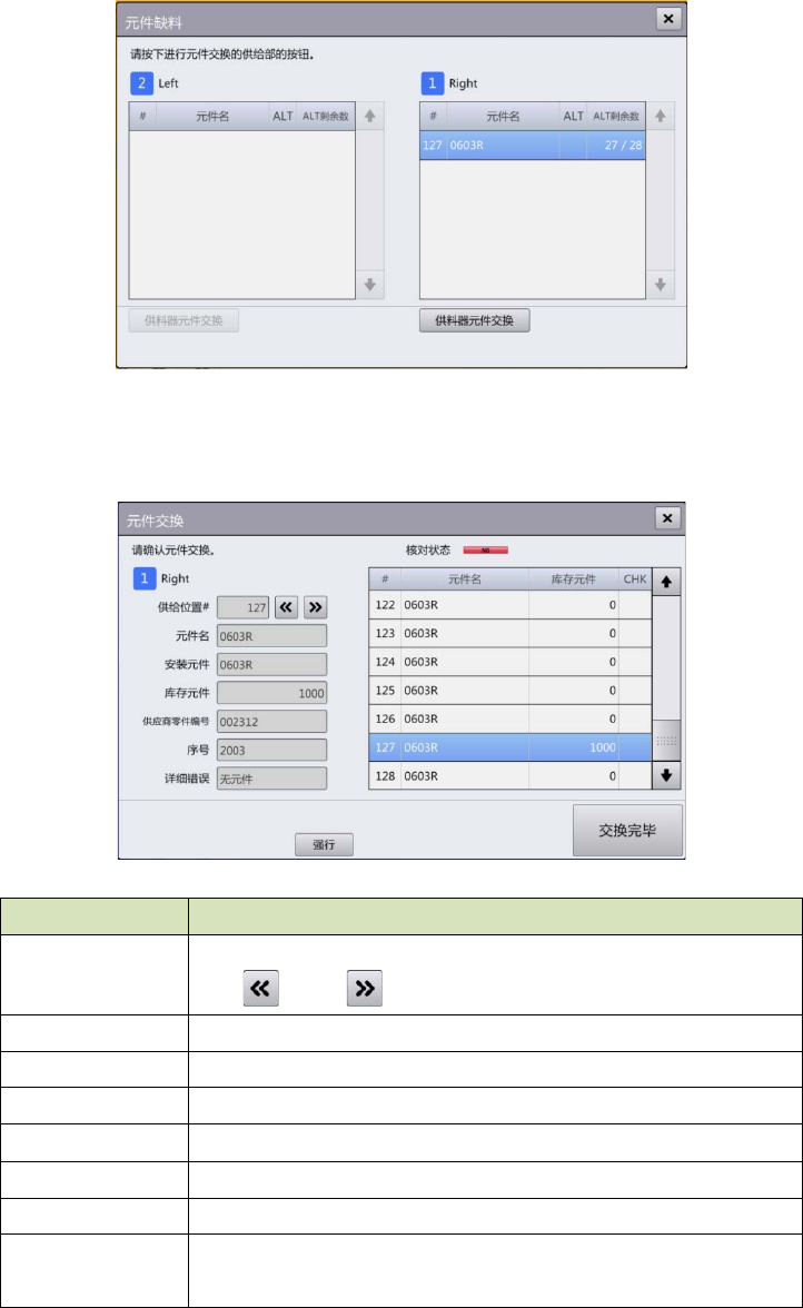 (2) 在[元件缺料] 对话框中触摸发生元件用完单元的 [供料器元件交换] 按钮,即显示[元件交换]对话