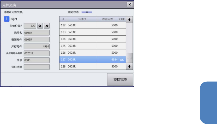 (8) 触摸[交换完毕] 按钮后,发生元件用完错误的供给位置的 [CHK] 变为 OK 的供料器,在实际供给