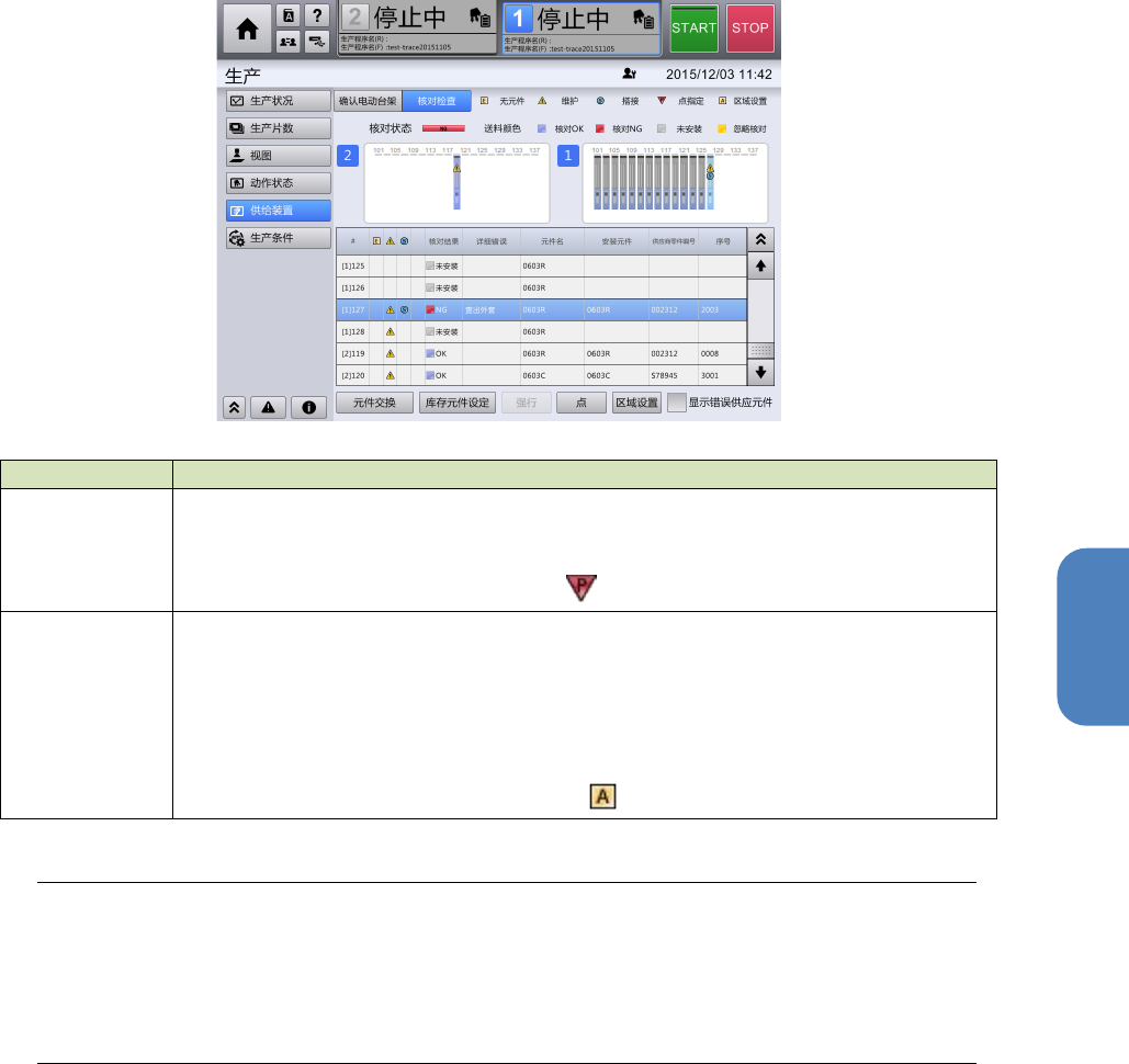 • 核对必要:发生元件用完停止后,将核对状态变为 NG。再使[元件交换(更换)] 对话框及 [供给