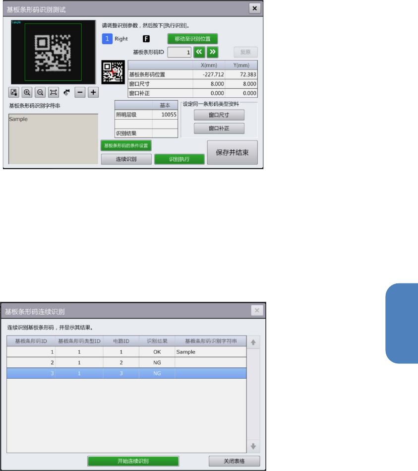 (16) 在[基板条形码识别测试] 对话框中,按下 [识别执行] 按钮,将使用当前的识别参数条件进行基板