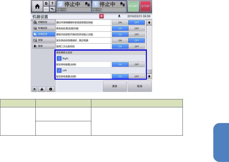 [误安装防止设定] 设定是否逐个台架实施核对确认。设定为 ON 时,生产开始前要进行元件核对。设