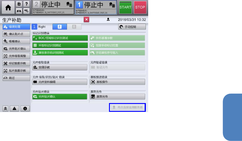 需在机器设置中重新连接服务器恢复通信。发生通信错误后,在从[顶部菜单]触摸[生产补助] -
