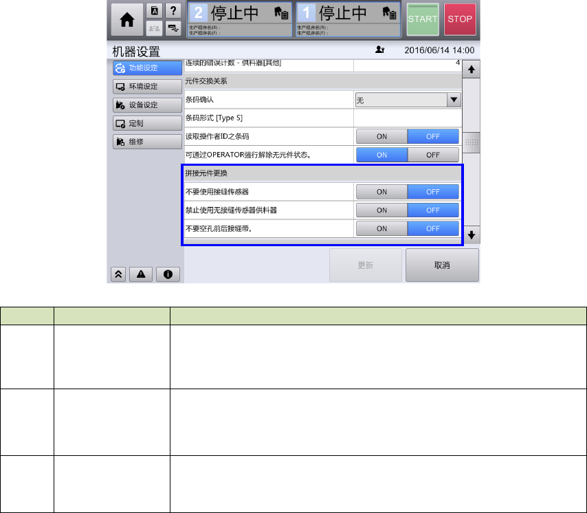 选择功能 ON/OFF,该功能为不能使用没有接缝传感器的供料器。