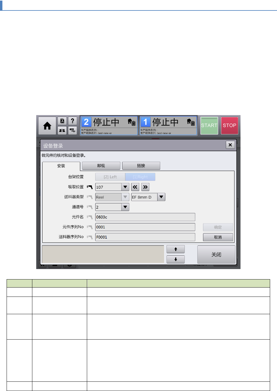 第 4 章 操作篇 4- 22. 外部输出功 能的使用(选 项) 568 4- 22 - 9. 设备登录 在外部输出功能 中,对装置的 元件安装操作 、卸载操作 及元件的搭接操 作是通过显示 [ 设备登录 ] 对 话框来 进行的。 [ 设备 登录 ] 对话框在 以下的画面中 触摸 [ 设备登 录 ] 按钮即可显 示。 • [ 生产 ] – [ 供 给装置 ] • [ 安排 ] – [ 供料器 设置 ] 画面 – [ 元件核对 ] 对话 …