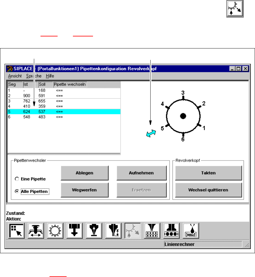 Betriebsanleitung SIPLACE F5/F5 HM 5 E inzelfunktionen Softwareversion SR.407.xx Ausgabe 01/2001 DE 5.2 Einzelfunkt ionen Portal 195 5.2.5.1 Funktionen In der Ansicht "Pipe tteno ffs et" steht nur die S chaltfl…