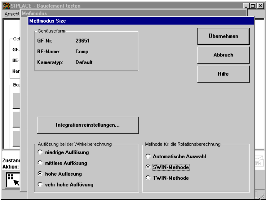 Nach Anklicken der Schaltfläche ’Einstellen’ des Messmodus ’Size’ wird das Menü ’Messmodus