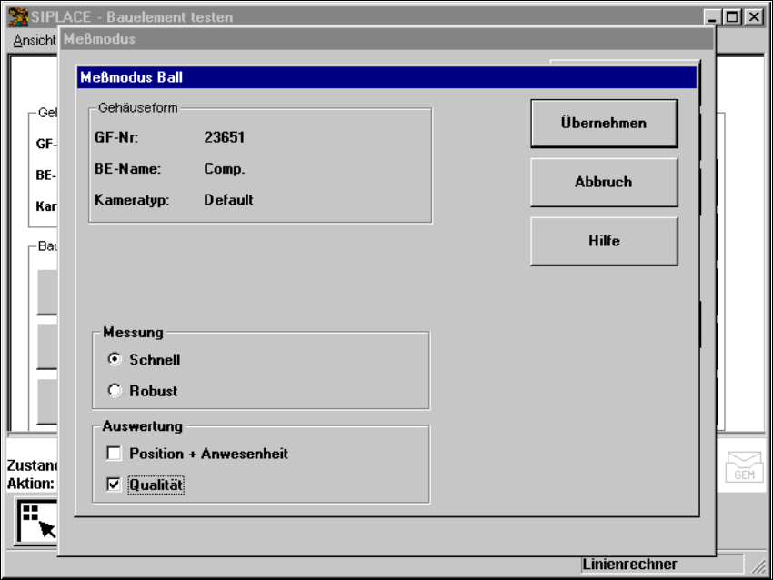 Nach Anklicken der Schaltfläche ’Einstellen’ im Messmodus ’Ball’ erscheint das Menü ’Messmo-