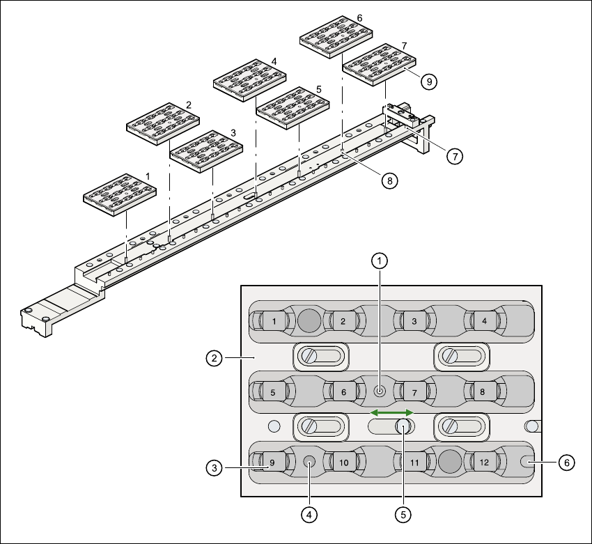 (6) Langloch für Zylinderstift (7) zum Zentrieren der Magazine