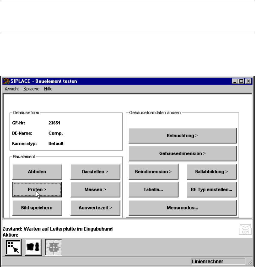 Betriebsanleitung SIPLACE F5/F5 HM 6 V isionfunktionen Softwareversion SR.407.xx Ausgabe 01/2001 DE 6.6 Bauelement testen 309 6.6.4.3 Option ’ Bauelement pr ü fen ’ HINWEIS 6 Dies e Optio n l ä sst sich nu r aktivie ren,…