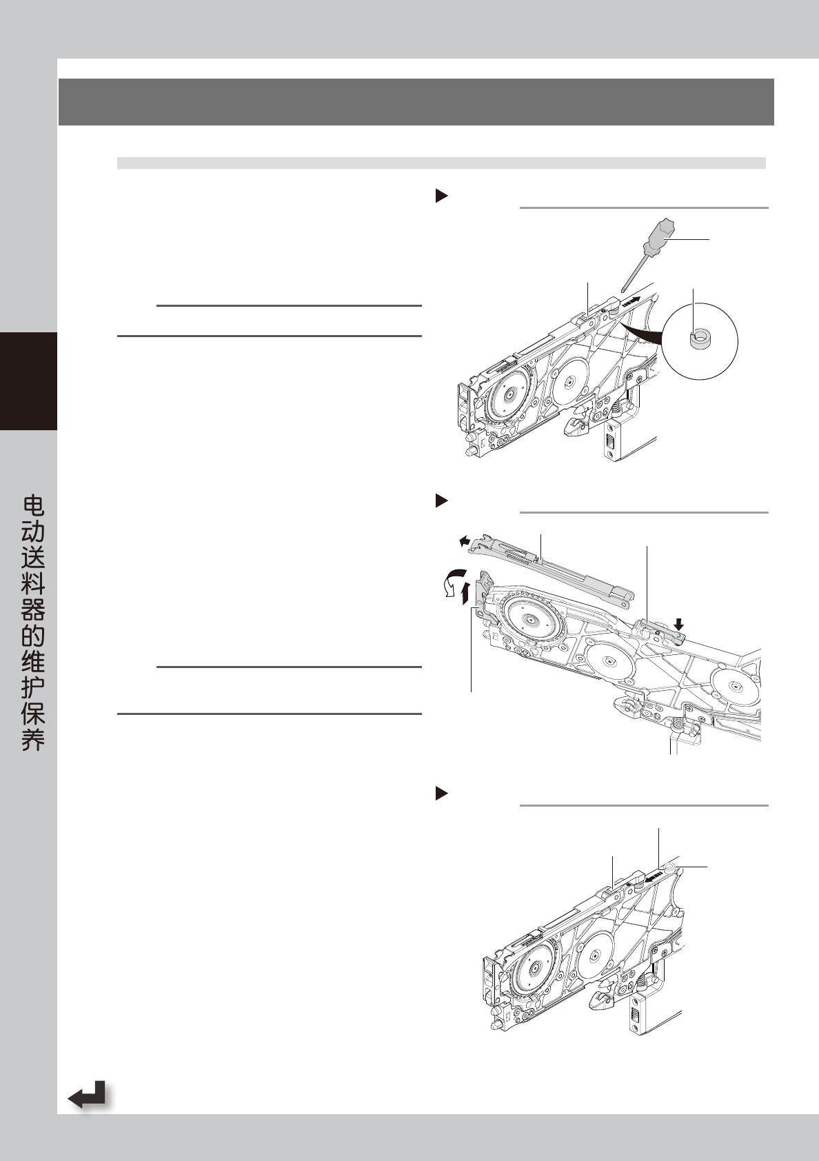 3-6 3 S S 3. SS 电动送料器的配件更换 3.1 压料盖的更换 1 从后端压料扣下方拆卸挡环。 1. 转动后端压料扣下方的挡环,使挡环上的切缝 朝向压料盖。 2. 将精密螺丝刀插入挡环,如右图中箭头所示方 向拆下挡环。 n 要点 拆下的挡环还需要再装回原位,请勿丢失。 2 拆卸压料盖。 1. 将前端压料扣边向上提起边向前拉开之后,将 压料盖斜向提起。 2. 按后端压料扣的右图中箭头所示部位,取出压 料盖。 3 换上新的压…