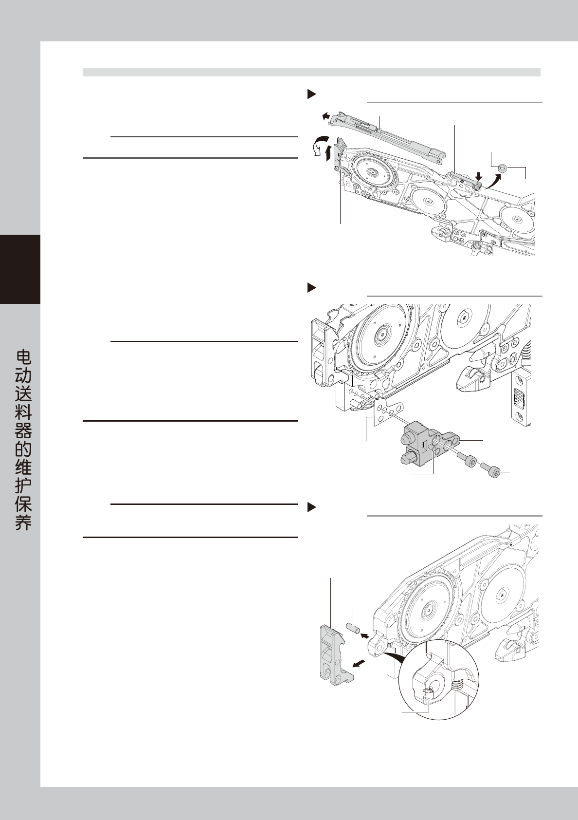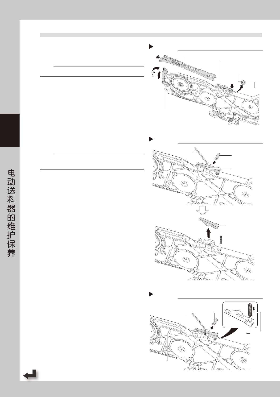 3-9 3 S S 5 换上新的前端压料扣。 1. 将弹簧套在新前端压料扣的凸部。 2. 将新前端压料扣装回原位,并对准前端压料扣 与送料器的轴孔。 3. 将轴插入轴孔。 4. 用内六角扳手 (1.5) 拧紧 1 处紧定螺钉固定轴。 y 拧紧扭矩 : 40N • cm c 注意 对准轴孔的位置时,请同时确认弹簧是否有足够的弹力。 6 将前端固定块装回原位。 将前端固定块装回原位,用内六角扳手 (2.5) 拧紧 2 处固定螺栓进行固定。…