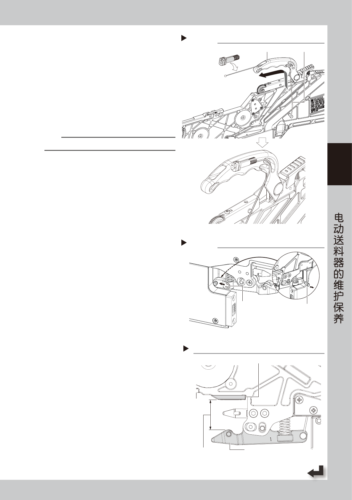 3-19 3 S S 5 换上新的钢丝。 将新的钢丝从把手与送料器的连接部侧插入,嵌入 钢丝导槽内。 6 安装张力弹簧、 紧线器 1 与张力垫片 1、 2。 在钢丝的球状部一端装上张力弹簧、紧线器与张力 垫片 1、2 ( 数片 ) 之后,将钢丝完全插入把手内。 7 将钢丝盖板 1、2 装回原位。 用十字螺丝刀 (No.1) 拧紧固定钢丝盖板 1、2 的螺 钉 ( 各 2 处 ),固定钢丝盖板。 y 拧紧扭矩 : 20N • cm n 要…