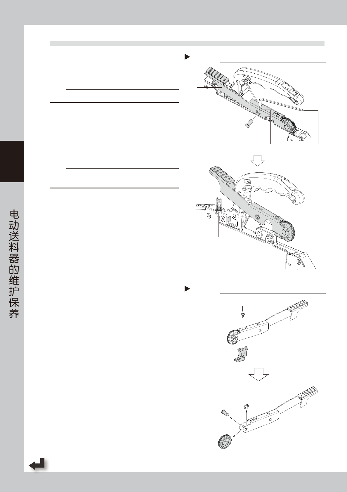 3-23 3 S S 3.13 把手的更换 ■8mmSS 电动送料器时 1 拆卸钢丝的轴。 1. 用精密一字螺丝刀拆下钢丝的 E 型圈。 2. 拔出钢丝的轴。 c 注意 • 拆卸 E 型圈时,请注意不要丢失。 • E 型圈为专用配件,万一丢失,请勿使用非指定的 E 型圈。 2 拆卸钢丝盖板 1、2。 用十字螺丝刀 (No.1) 拆卸固定钢丝盖板的螺钉 ( 各 2 处 ) 之后,取下钢丝盖板。 3 拆卸张力垫片 1、 …