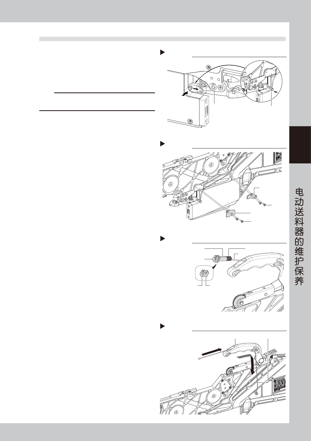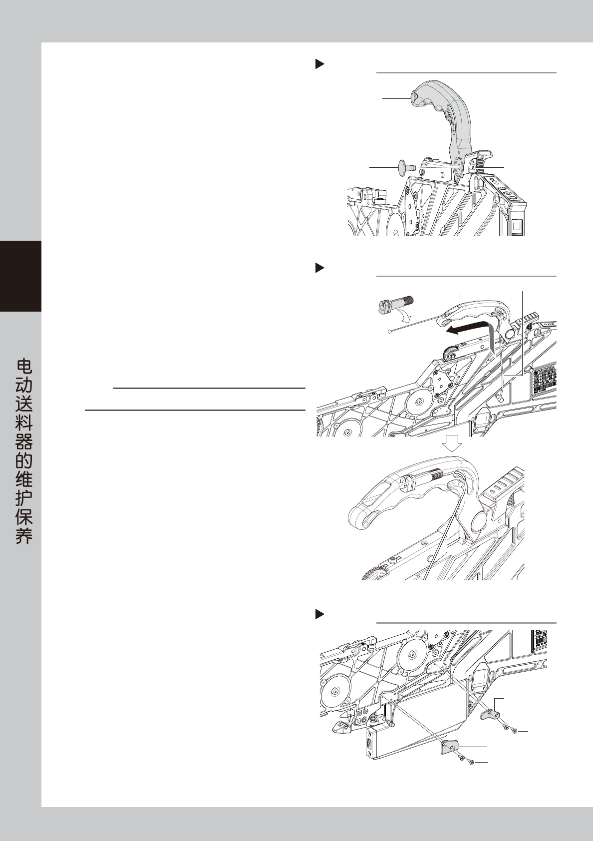 3-24 3 S S 5 拆卸把手。 用内六角扳手 (1.5) 拆下固定把手栓的紧定螺钉 (1 颗 ) 之后,拔出把手栓,取下把手。 6 安装新的把手。 1. 换上新的把手,插入把手栓。 2. 在紧定螺钉 (1 颗 ) 上涂上螺纹密封剂 (LOCTITE 241)。 3. 用内六角扳手 (1.5) 拧紧在 2. 中涂抹了螺纹密 封剂的紧定螺钉固定把手栓。 y 紧定螺钉的拧紧扭矩 : 40N • cm 7 安装钢丝。 将钢丝从把手与送料器…
