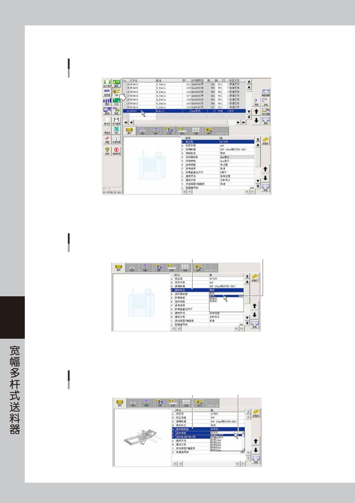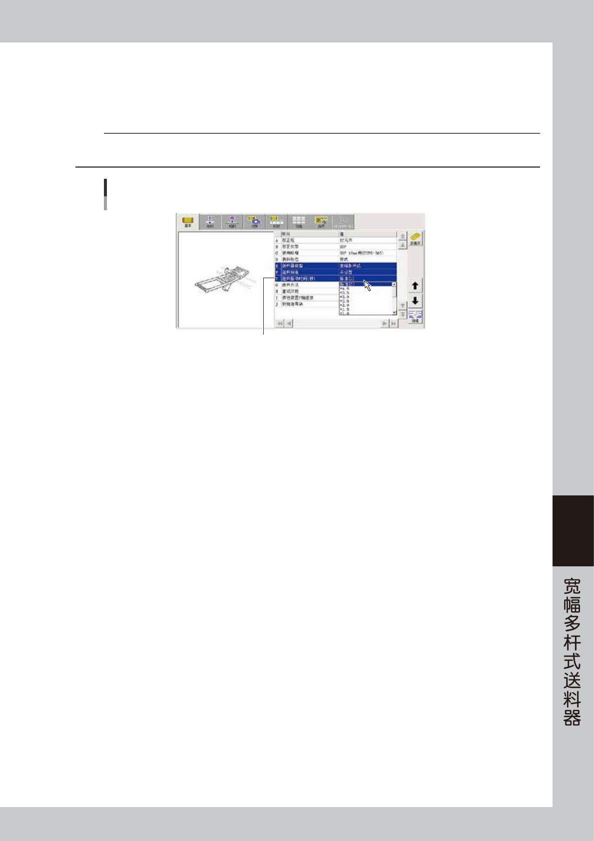 选择“E 送料器类型”并双击输入栏,从下拉框中选择“宽幅多杆式”或“多杆式”