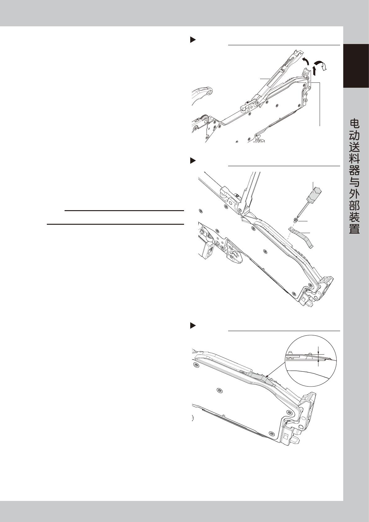 1-15 1 S S 1.6.2 弹簧片的安装 下面,介绍安装弹簧片的方法。 1 提起压料盖。 将前端压料扣边向上提起边向前拉开之后,提起压 料盖。 2 安装弹簧片。 1. 将弹簧片装入送料器的走带槽中。 2. 对准弹簧片的螺孔与走带槽中的螺孔之后,用 精密十字螺丝刀拧紧固定螺钉 (1 颗 ) 固定弹簧 片。 y 拧紧扭矩 : 20N • cm 3 确认弹簧片的安装状态。 确认弹簧片的顶面比走带面高出 1mm 左右。 4 固定压料盖。…