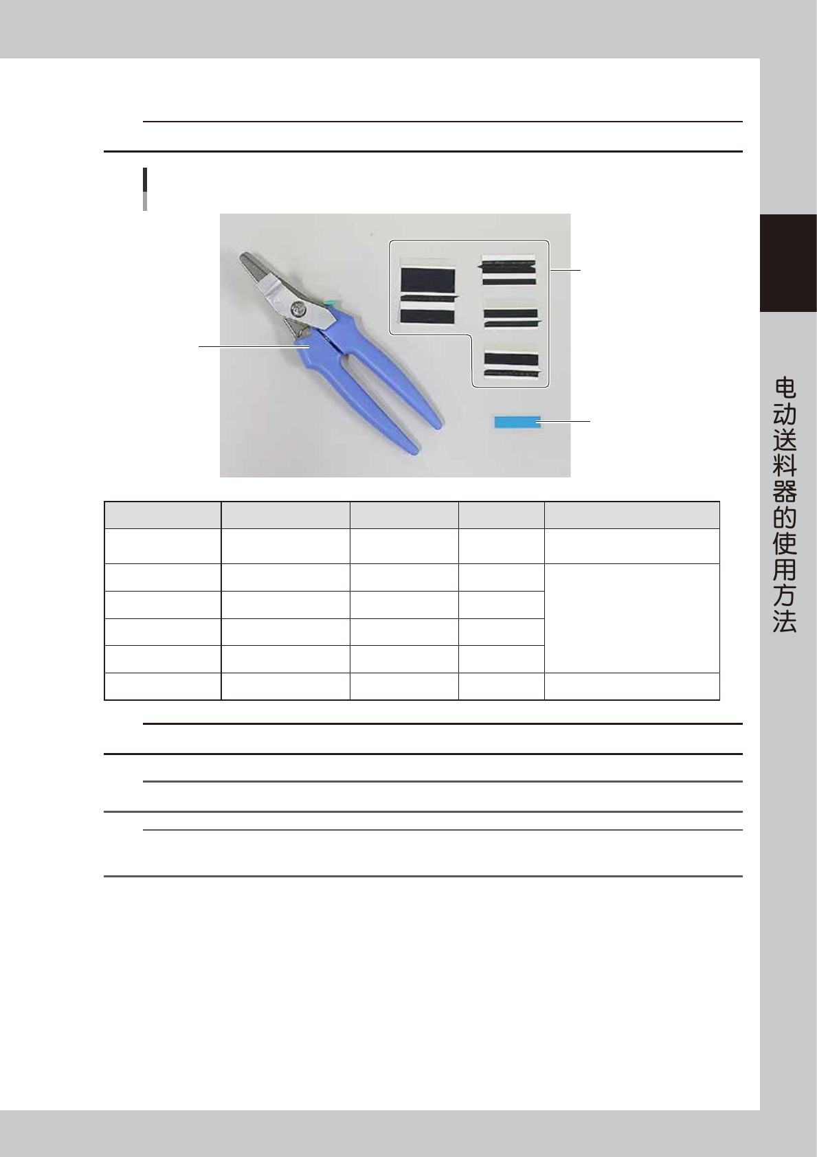 2-32 2 S S 6.1 料带拼接用工具 拼接料带需要使用下列工具、拼接胶带等。请预先准备。 必备工具 拼接料带时使用 料带剪刀 料带拼接夹具 蓝色拼接胶带 加固用拼接胶带 65235-9L-00 名称 配件名 配件编号 数量 备注 料带剪刀 JIG, T APE CUT KJ3-MY045-10X 1 需要剪断较宽的料带时,请使用市面 销售的长刃剪刀。 料带拼接夹具 T APE CONNECTOR KJ3-MY020-10X 1…