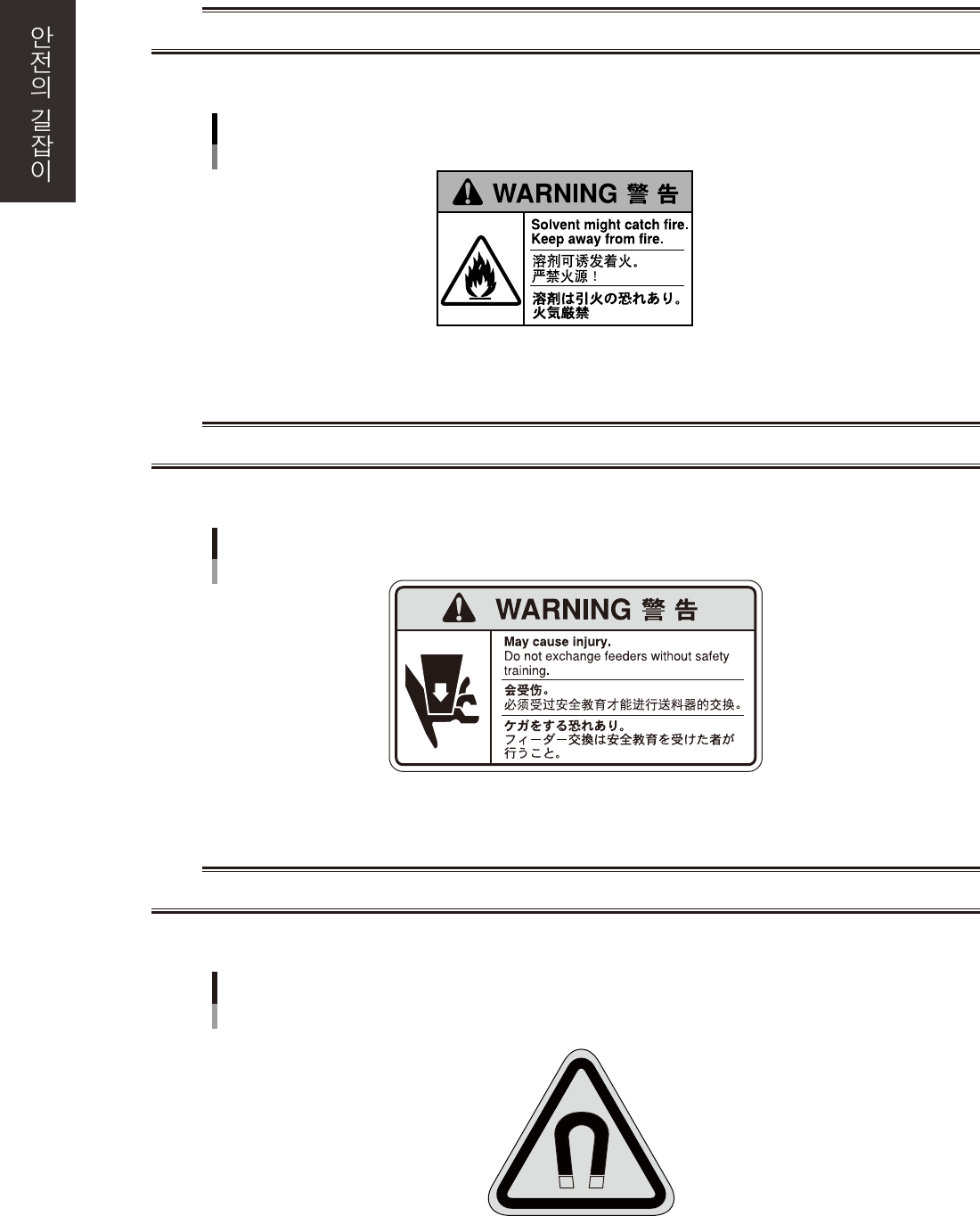 xv 3 .2 주 의 표 시 3.2. 1 인 체에의 영 향 ■ 주 의내 용 c 주의 커버 내 의전 원부 를만지 면 ,감전 될위 험 이있 으므로주의 하 여주십시 오 . ■ 대 상장 비 모든 장 비 고압주의 만지면 감전위험 있음 9110 1- L C - 0 0 ■ 주 의내 용 c 주의 가동 부 의모터 는고 온상 태 이 므로만 지 지말아주 십 시 오 . ■ 대 상장…